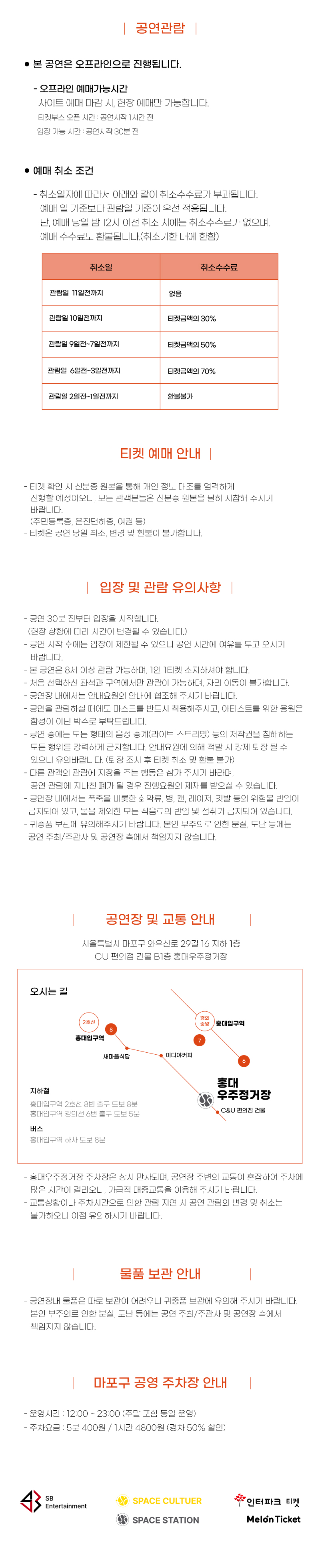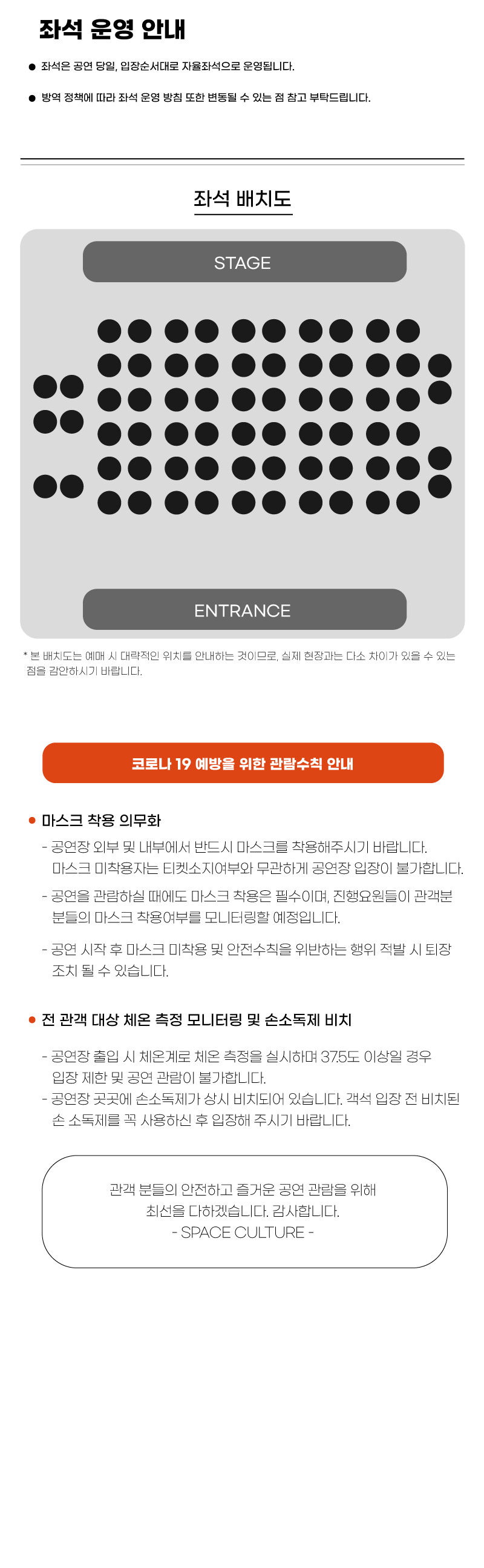 ※ 공연일 기준 코로나 19 상황과 정부의 방역지침에 따라 공연 관람 수칙이 변경될 수 있습니다.