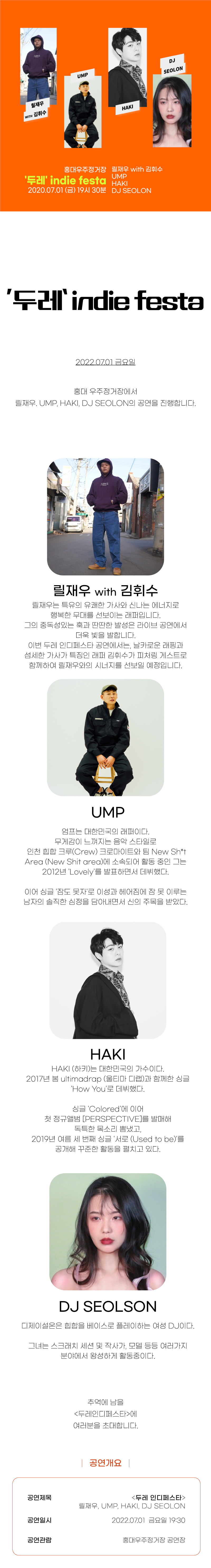 [우주티켓] '두레' indie festa - 릴재우, UMP. HAKI, DJ SEOLON 공연 (2022.07.01.금.19시30분)