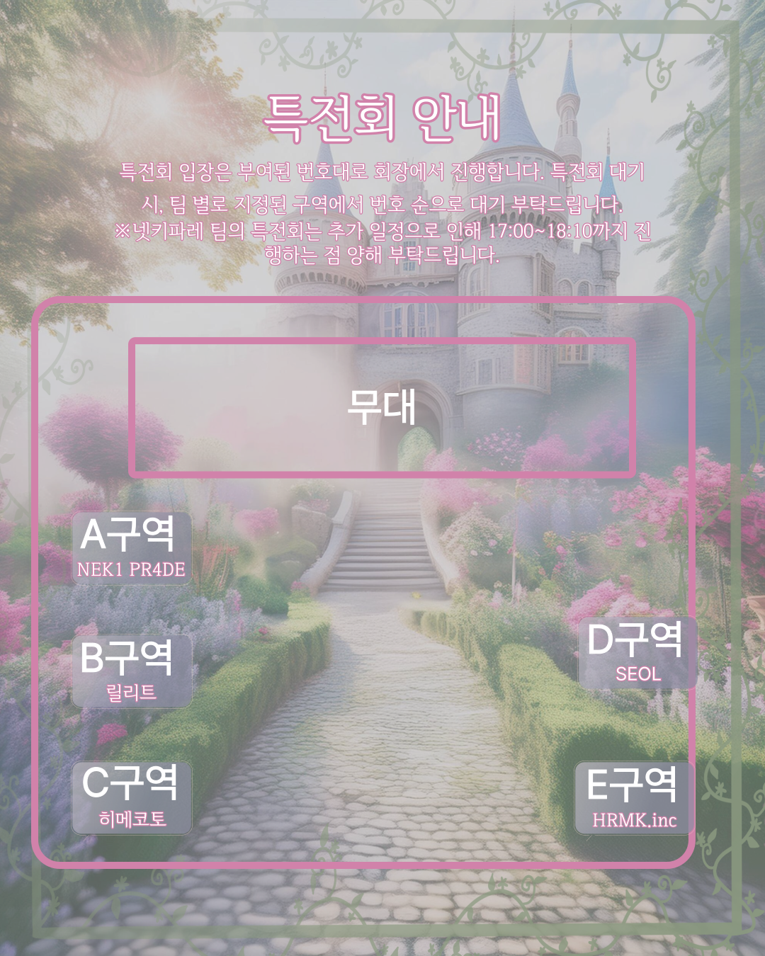 ▪본 공연에서의 넷키파레 팀은 추가 일정으로 인하여 부득이하게 17:00 - 18:10으로 특전 시간을 조정하는 점 양해 부탁드립니다.
